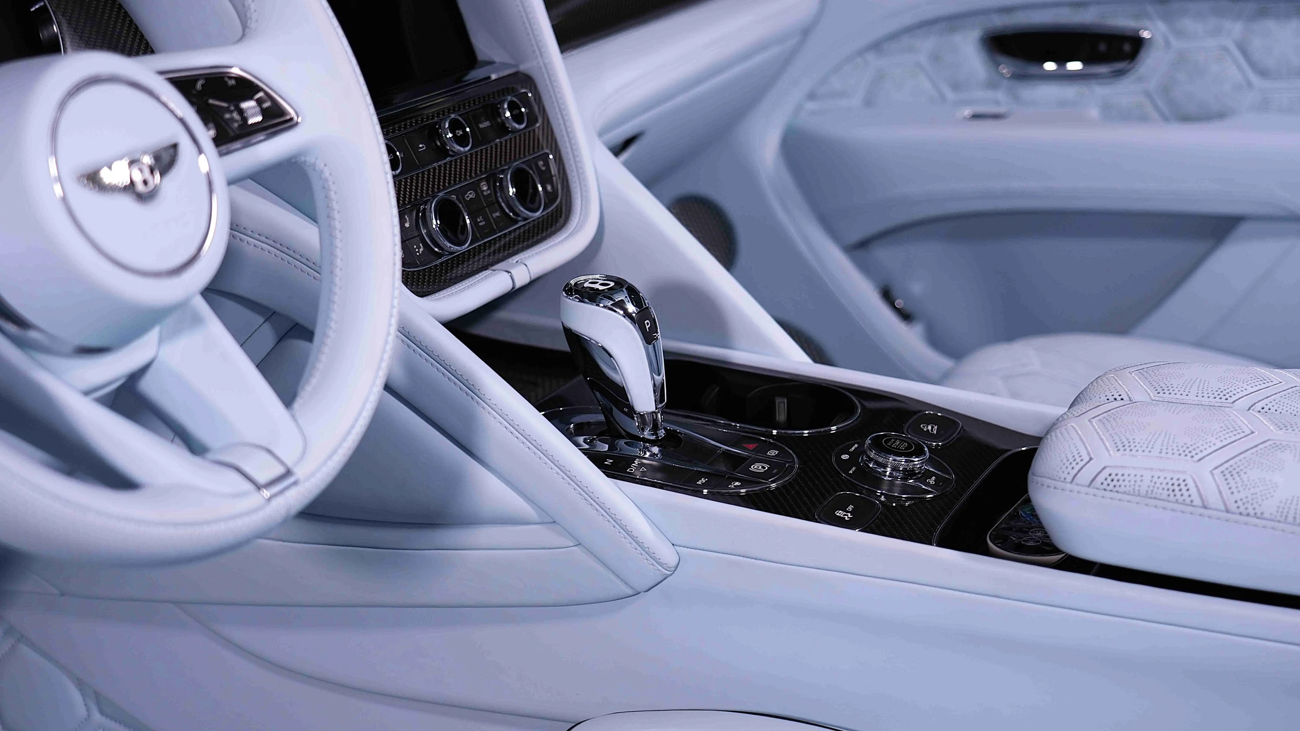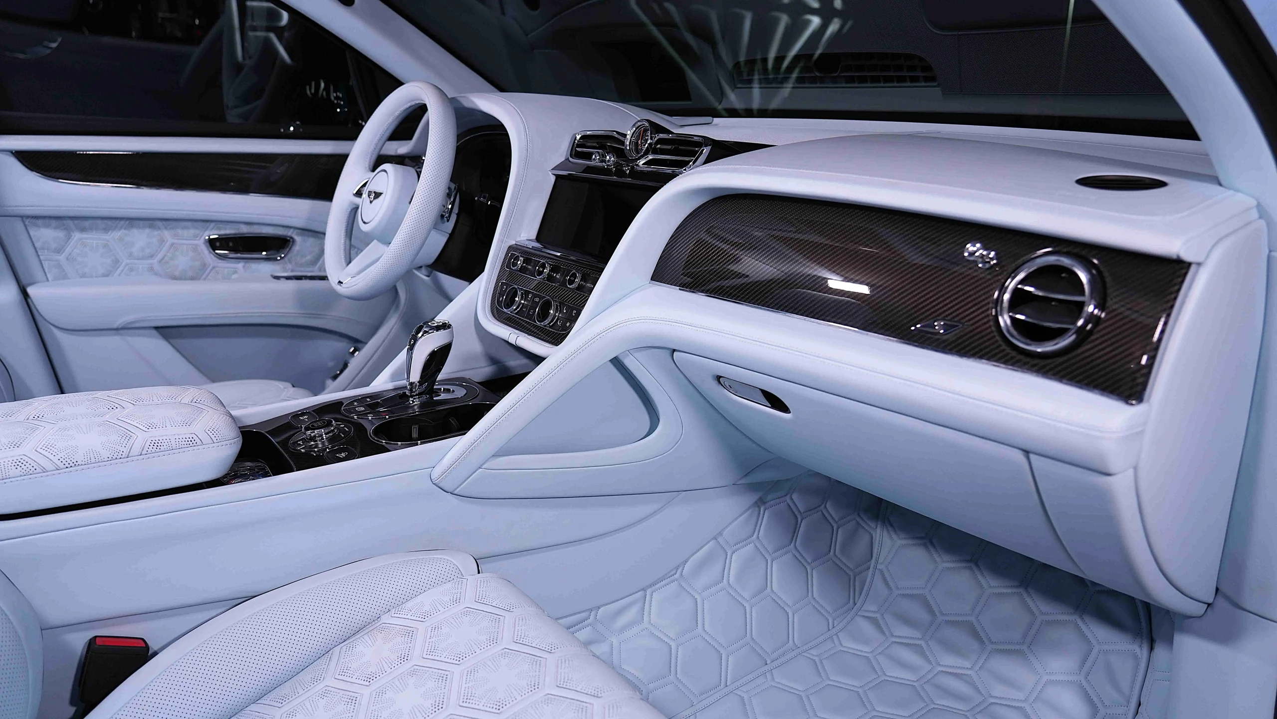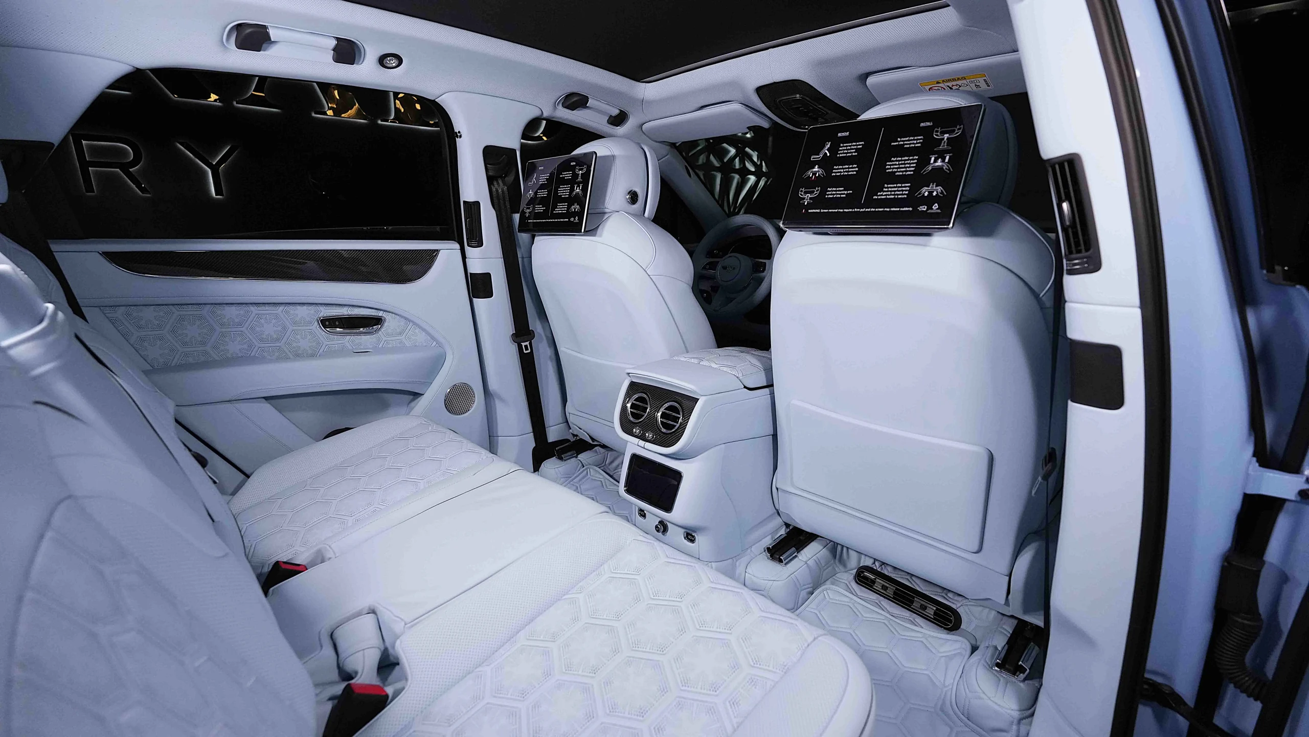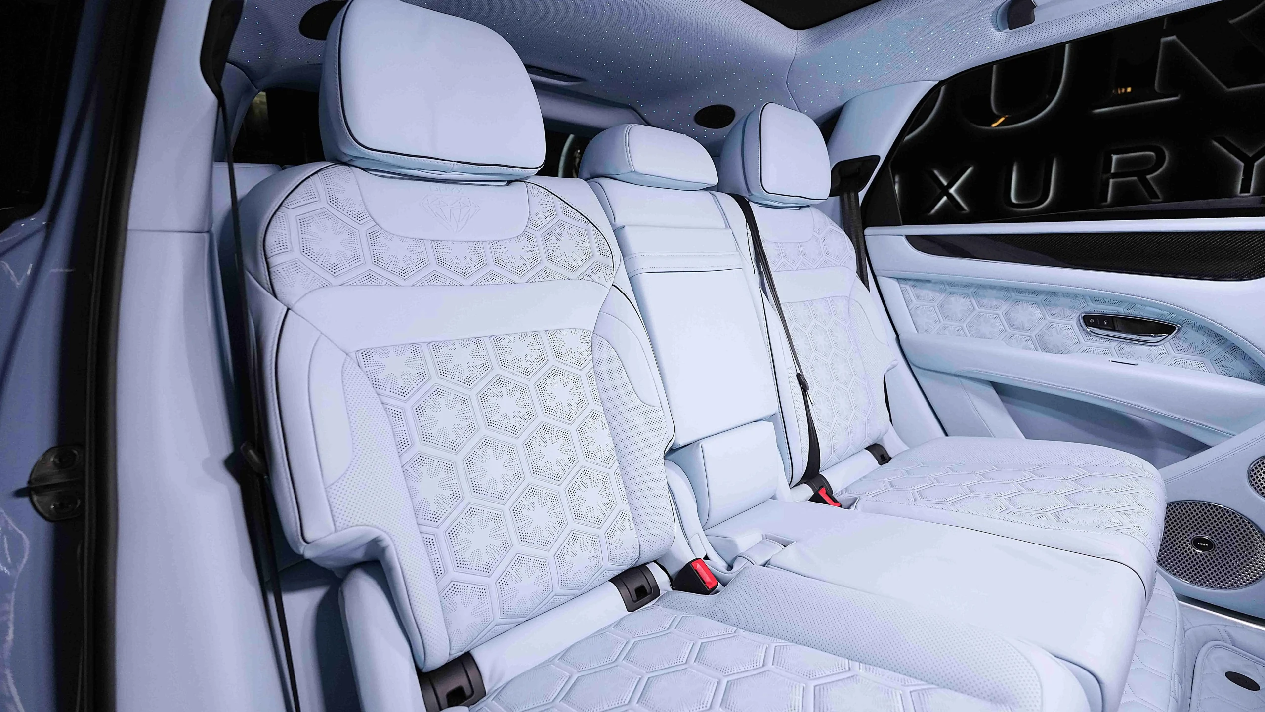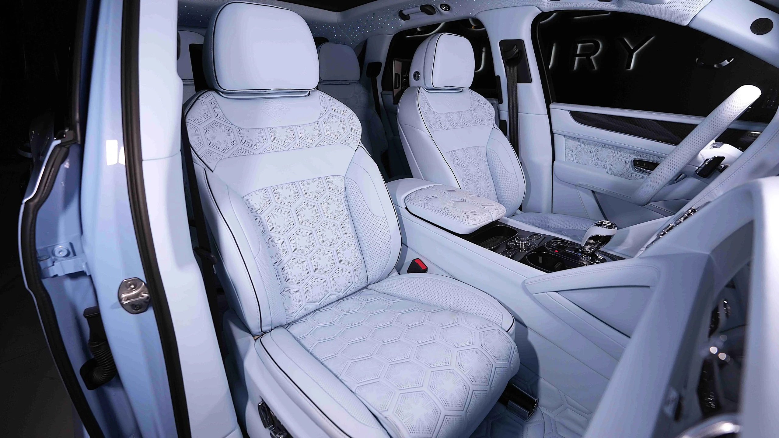 – Main Hide Baby Blue Onyx Carpets Baby Blue Onyx / Emblem Stitching Baby Blue / Seat Piping in Beluga Black / LED Welcome Lamps