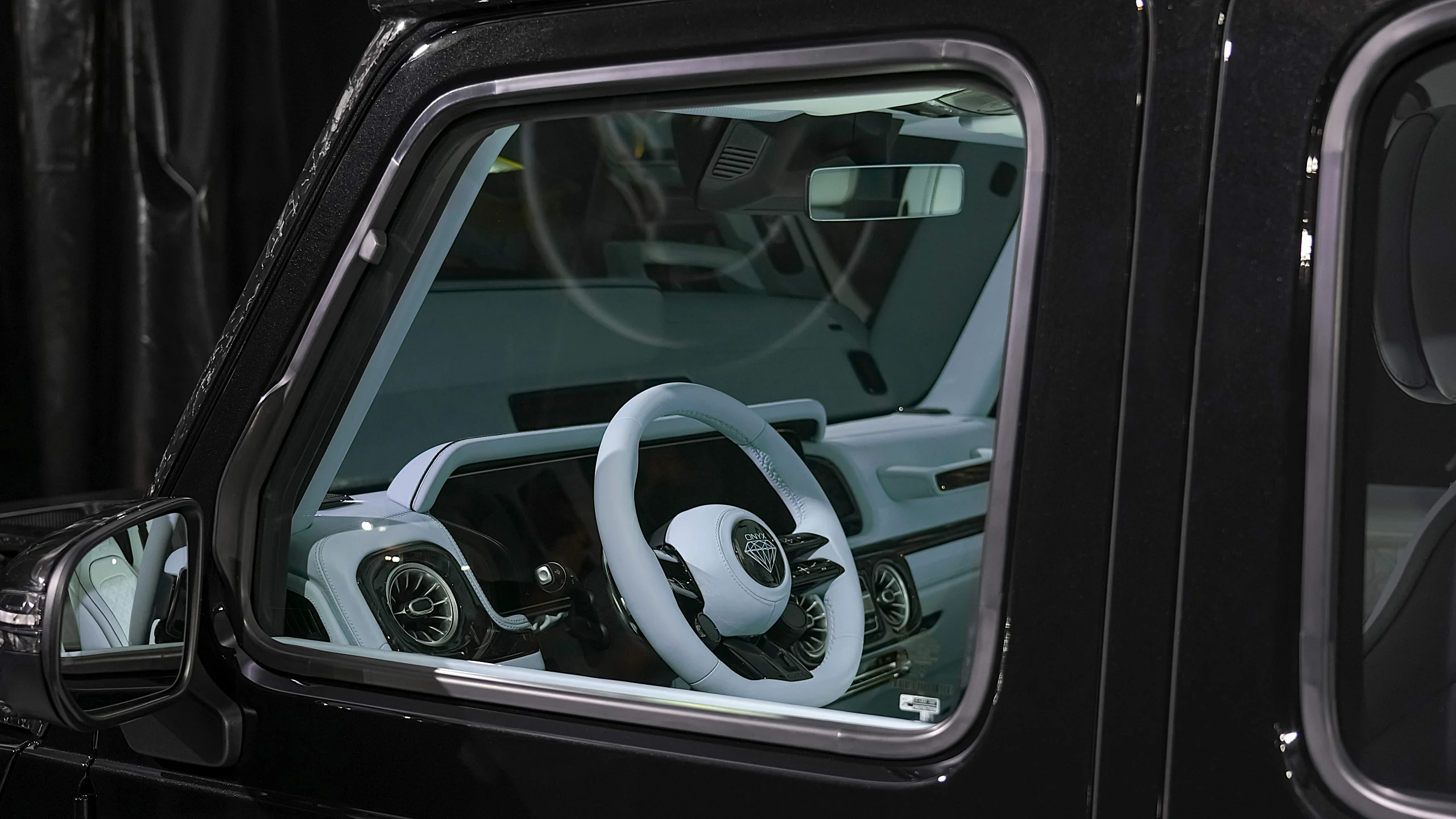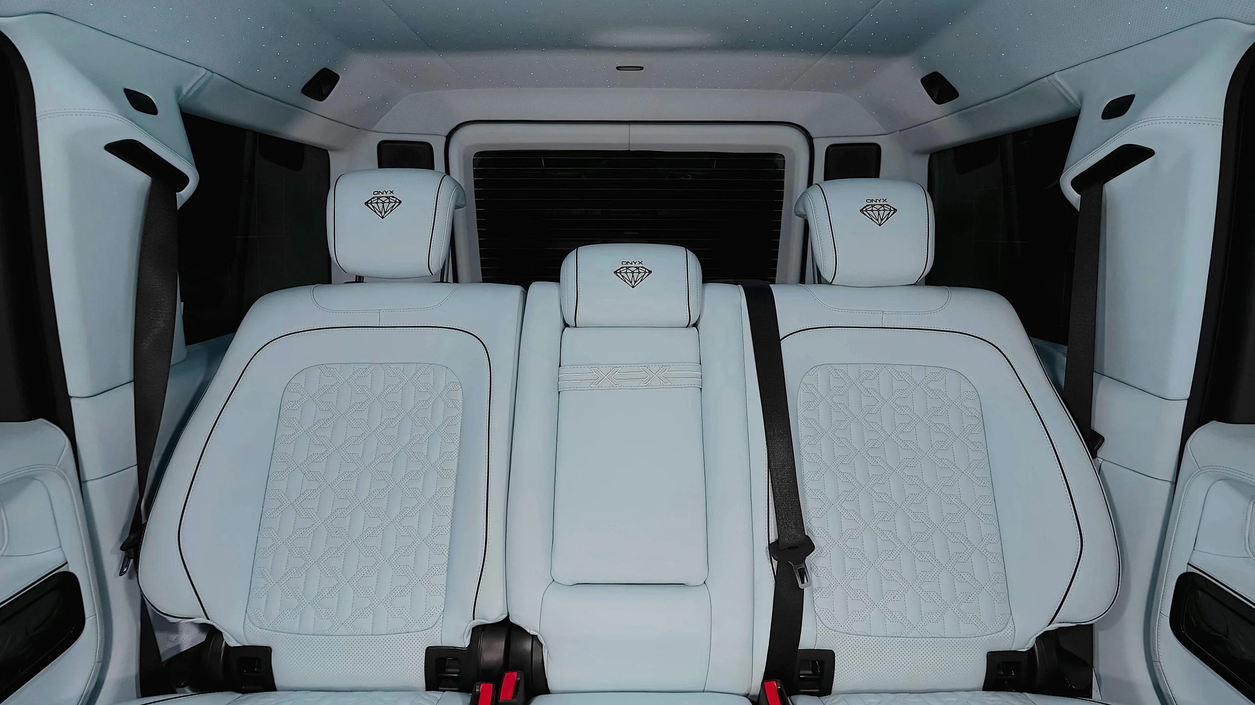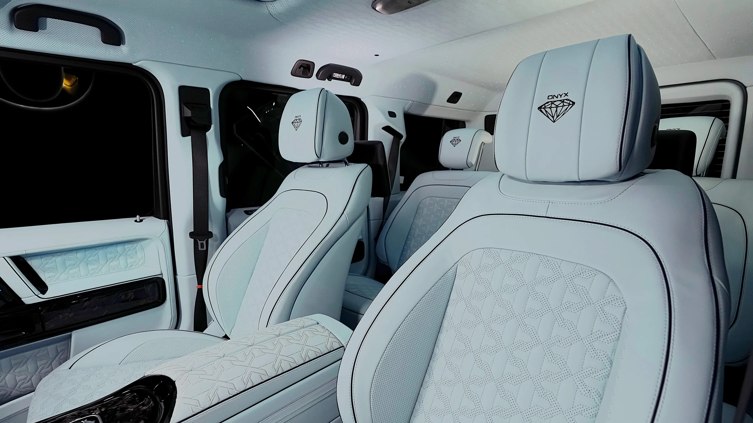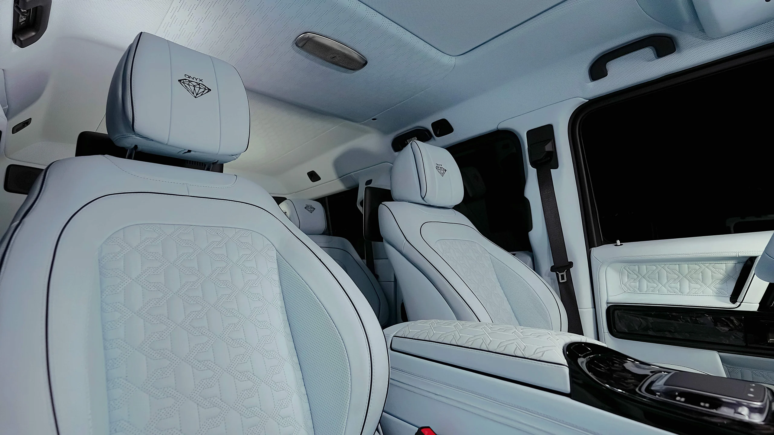 – Complete Refined Interior by Exclusive Leather Sorts Seats Baby Blue with Black Stitching matched with Onyx Emblem