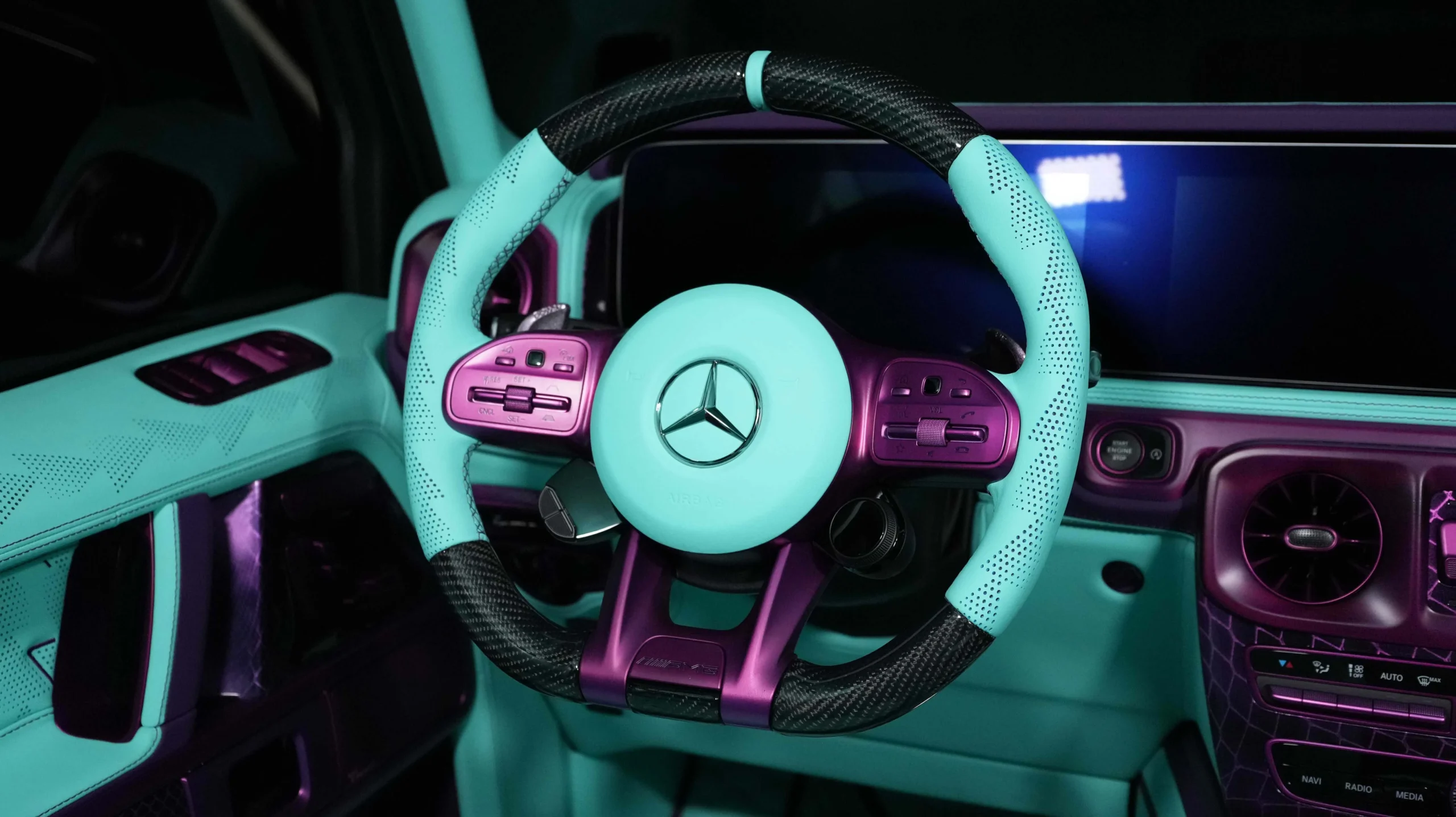 – Sport steering wheel in tiffany blue leather and glossy carbon fiber