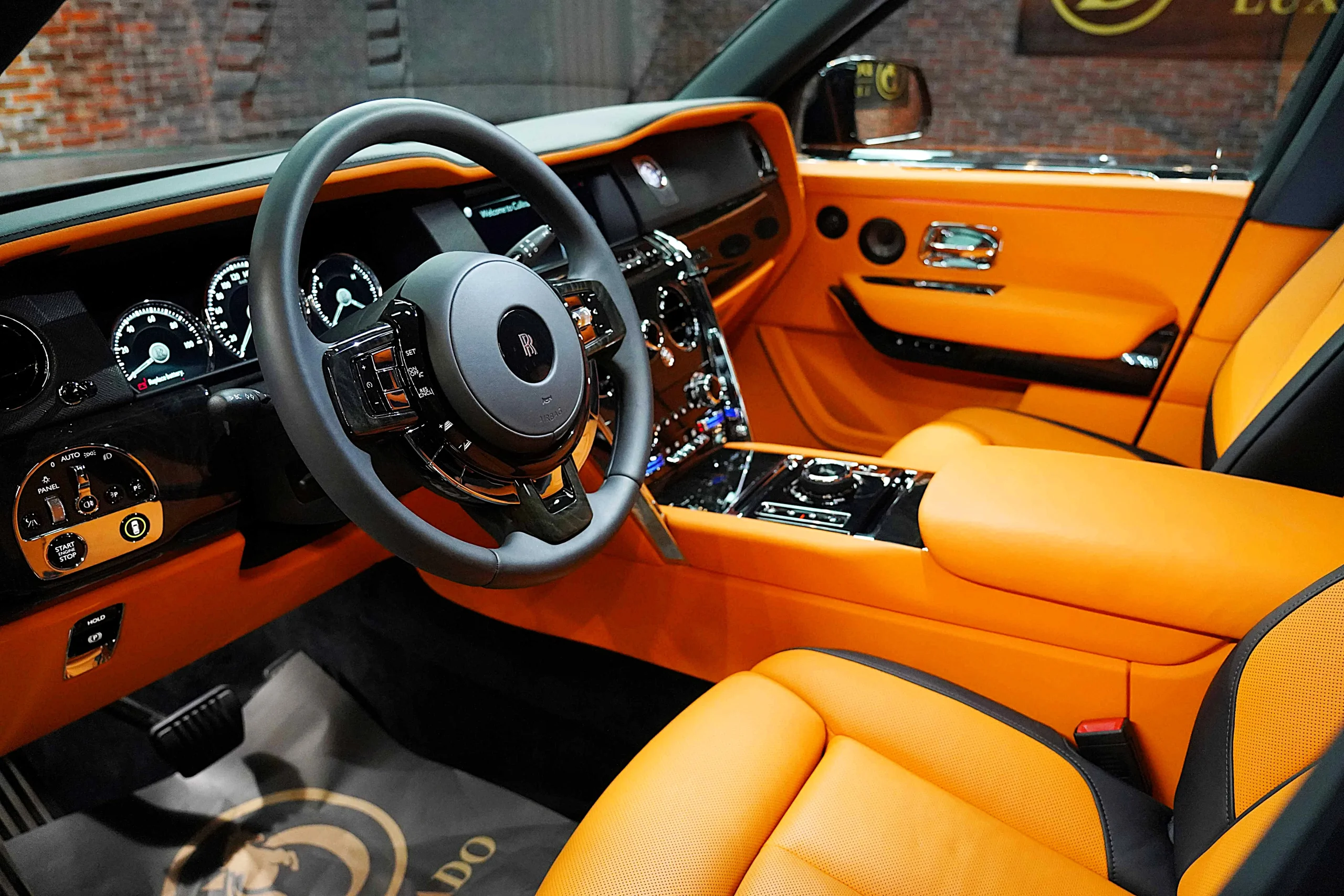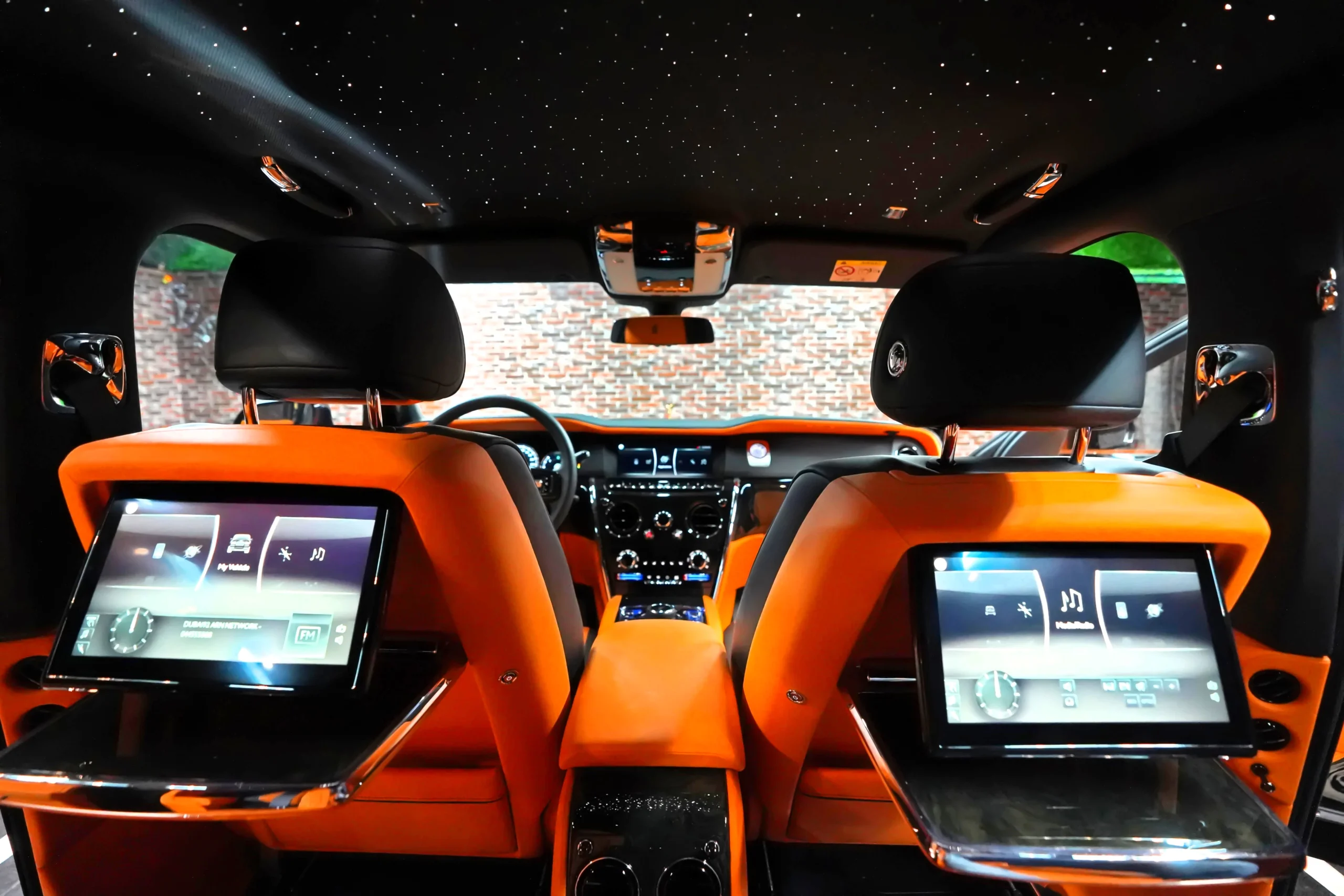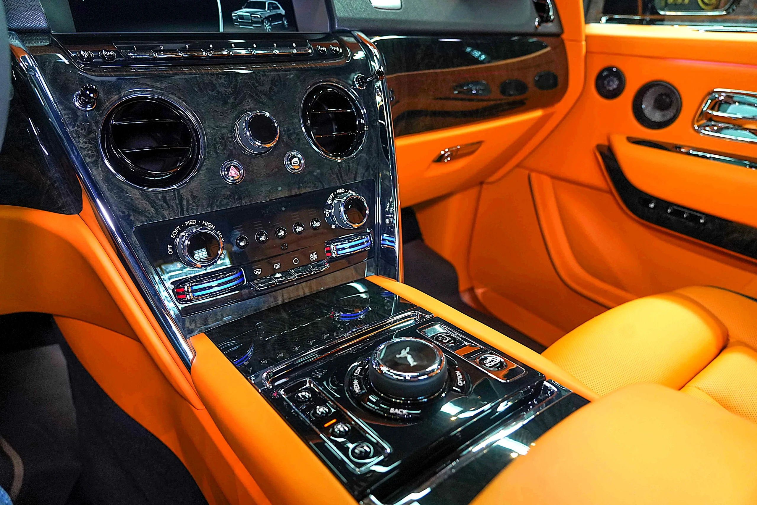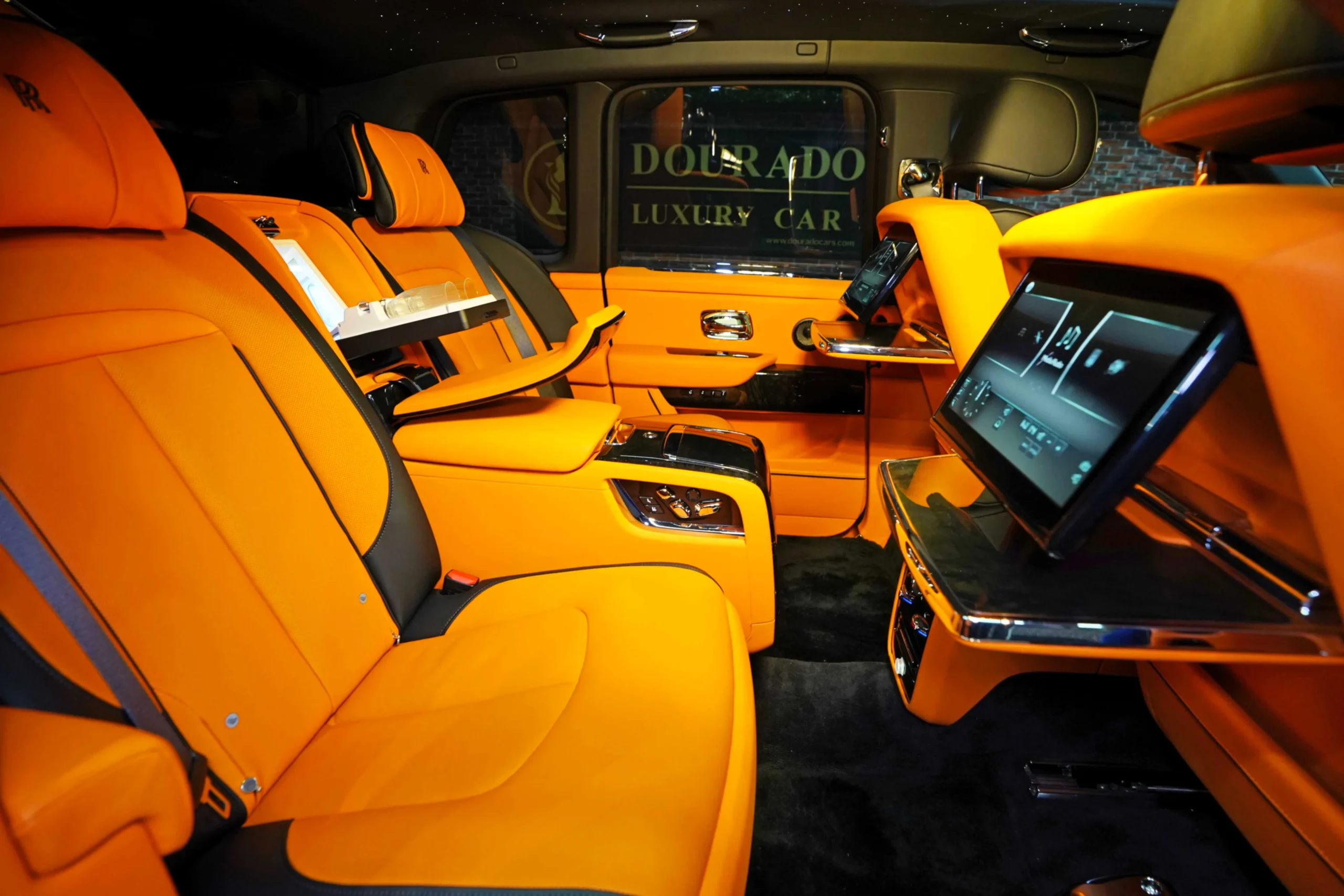 Step inside the Cullinan Onyx Concept, and you’re greeted by an interior that contrasts beautifully with the exterior. The vibrant Orange leather upholstery is not just striking but also exquisitely crafted. Every seat, panel, and surface is wrapped in the finest leather, with meticulous attention to detail in the stitching and finishing. The color scheme adds a lively, modern twist to the classic luxury of the Cullinan, creating an environment that is both bold and inviting.