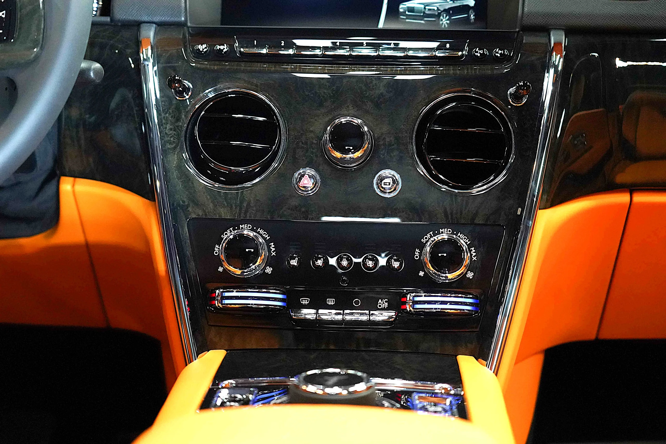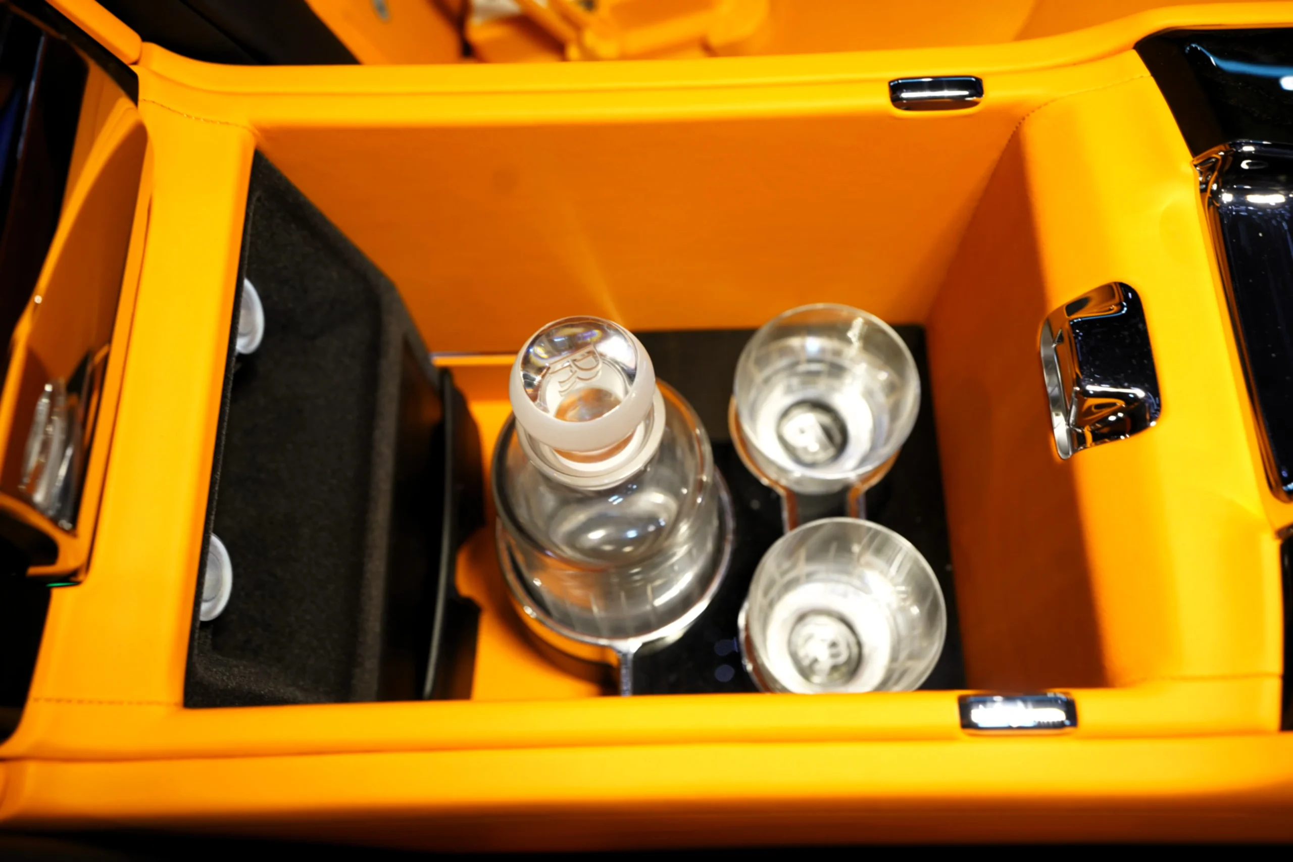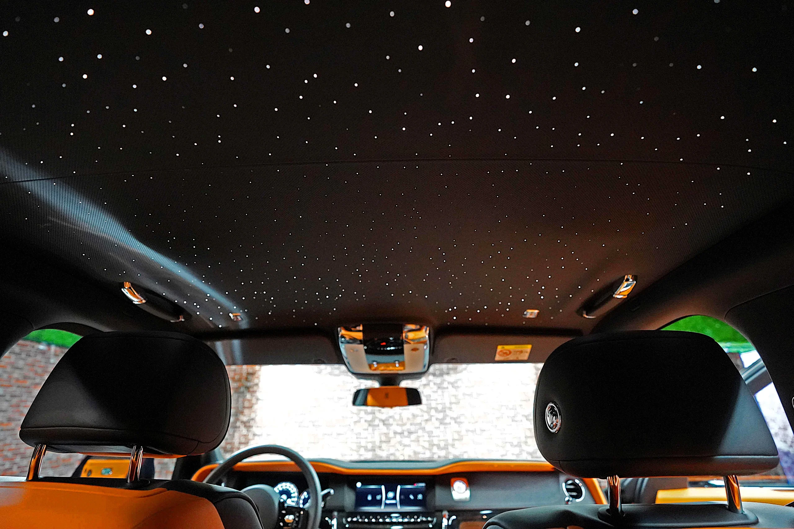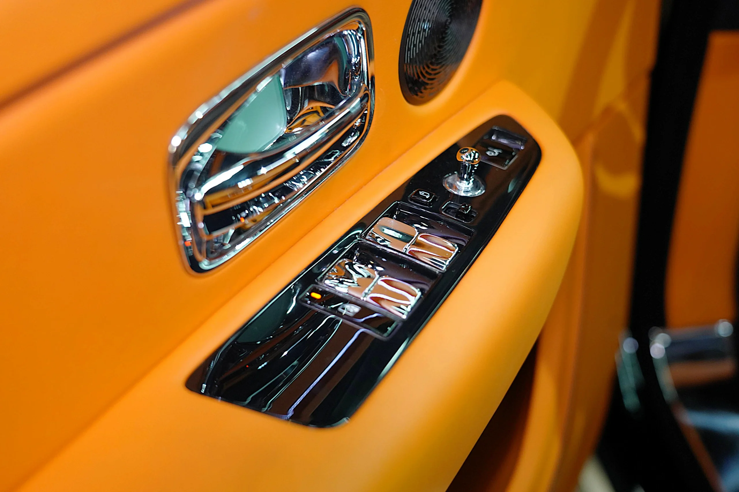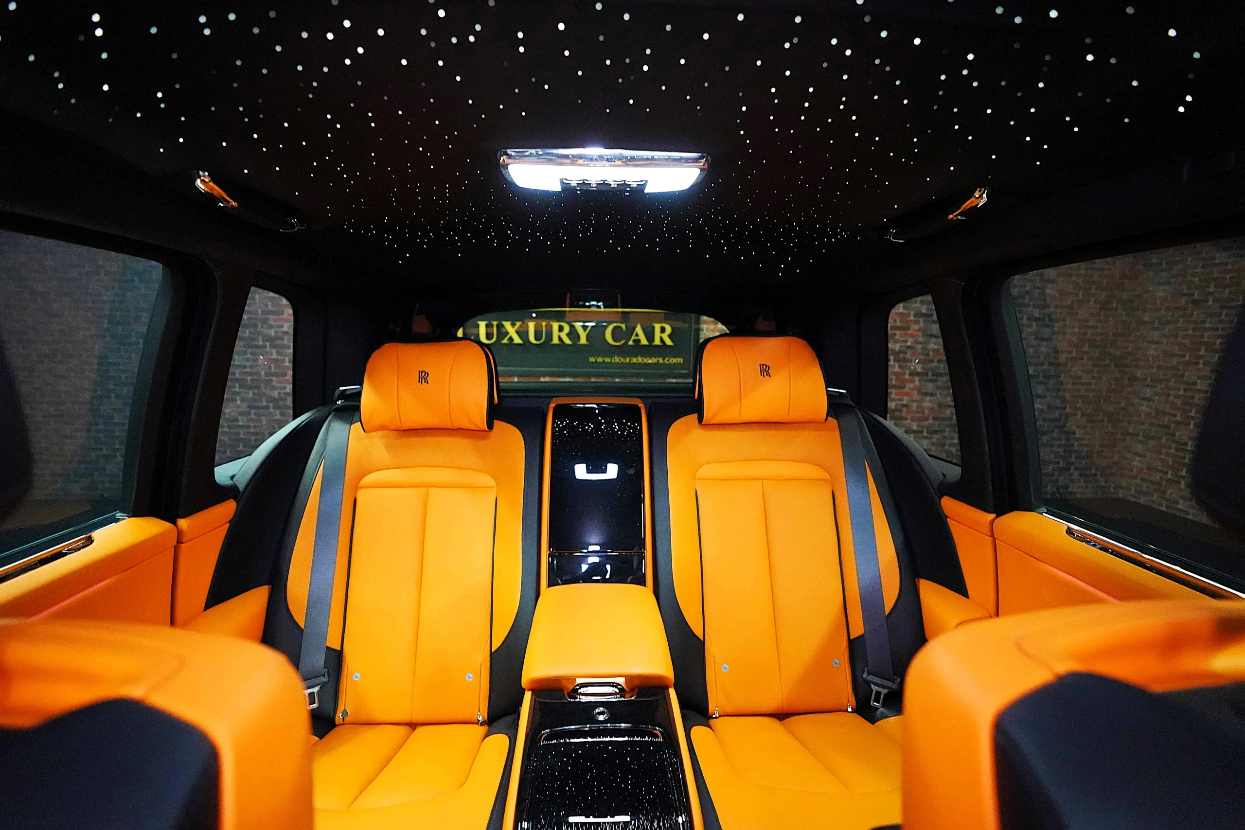 Step inside the Cullinan Onyx Concept, and you’re greeted by an interior that contrasts beautifully with the exterior. The vibrant Orange leather upholstery is not just striking but also exquisitely crafted. Every seat, panel, and surface is wrapped in the finest leather, with meticulous attention to detail in the stitching and finishing. The color scheme adds a lively, modern twist to the classic luxury of the Cullinan, creating an environment that is both bold and inviting.